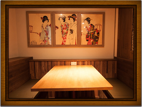 人気のお席は、和のアートを飾ったテーブル個室。柔らかい照明も手伝って寛いだ気分でご宴会をお楽しみいただけます。北新地本店では、個室は最大30名様までご利用可能。ご宴会、ご接待、団体パーティーなど幅広いシーンでご利用ください。