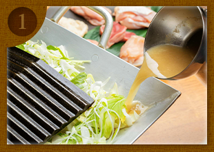・鉄板の周りの堀に,鶏白湯スープとお野菜を沸騰させます。