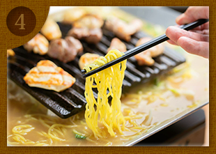 鉄板で焼く鶏の脂がそのままスープに入り、スープに鶏の旨みが凝縮されます。 -