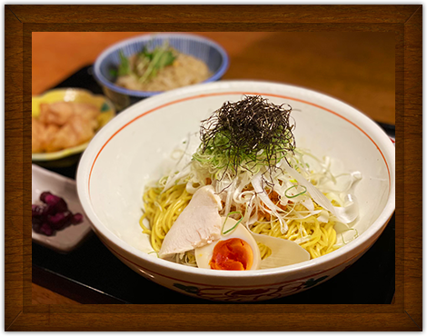 ・まぜそば ・小鉢 ・鶏めし 又は 卵かけご飯 ・香の物 -